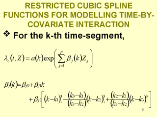Here, the survival time t of each patient is replaced by sequential time segments. As a consequence, instead of using the exact follow-up time we rounded it to the nearest in months. In the formula t is replaced by k the time segment in months and k1, k2 and k3 indicate the time-segments in which the 3 knots are located. As we‘ve seen before there are only 3 parameters for each restricted cubic spline function and so there are 3 times p parameters for the p covariates. All these parameters are estimated by the full maximum likelihood method.