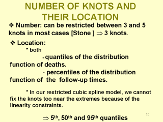 Like all these methods using spline functions, it requires the number and placement of the knots to be specified. By increasing the number of knots, we increase the flexibility of the spline function, but this also increases the variance associated with each coefficient. The practical experience of most of the authors suggests that we can limit the search between 3 and 5 knots. So, we decided to a priori restrict the number of knots to three in order to keeping the number of knots for minimum. For the placement of knots, two approaches have been general employed based either on event times or on all follow-up times both censored and un-censored. We have used here the two approaches, using the 5th and the 95th percentiles of the distribution. |