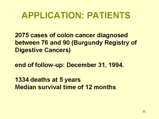 All these models (see next 2 slides)were employed to find cancer data collected by the Burgundy Registry of Digestive Cancers in the Framework of a population-based study. Four classic prognostic factors were evaluated in this study : sex, gender, age, cancer stage at the time of diagnosis, and period of diagnosis. Cancer extension at the time of diagnosis was classified according to the Tumor Nodes Metastasis (TNM) classification. The median survival time is 12 months and the percentage of censoring is about 45% with 1,334 deaths. |