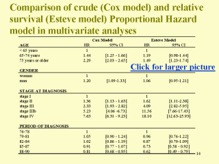 This table compares the results of the Cox model and Esteve’s model, which are both restricted by the PH assumption. This Table shows that the effects of gender and age appear much weaker in the relative survival analyses than in the Cox model analyses : the effect of gender and of the middle age even lose their statistical significance with the Esteve’s model. On the contrary, the effects of cancer stage and of the period of diagnosis are stronger in the relative survival analysis than in the Cox model analysis.
