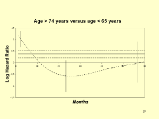 These Figures (see next 2 slides) show the hazard ratio (HR) estimates obtained with the PH relative survival model of Estève and the non-PH cubic splines model. AGE: The constant PH model considerably underestimates early risks (The confidence intervals do not overlap) and overestimates later risks. These results are consistent with those shown before for the piecewise PH relative survival model but the smooth spline estimate is more clinically plausible than the disjoint step function Moreover, the model based on restricted cubic spline functions (only 3 parameters for three knots, independent of the number of time-segments) is more parsimonious than the piecewise PH relative survival model (6 parameters for 6 time segments). STAGE: According to the cubic spline model, the impact of higher stage, reaches maximum at approximately 2 years. This estimated pattern suggests that advanced cancer stages have relatively moderate impact on very early mortality, mostly due to post-surgical complications. This impact increases sharply during the first year after the diagnosis and then gradually decreases over several years, with hazard ratios being elevated even 10 years later. PERIOD OF DIAGNOSIS: Due to the flexibility of the cubic spline functions, this cubic spline model allowed us to fit the inversion of the HR with time as shown in this figure for period of diagnosis. In contrast to the PH relative survival analysis, the restricted cubic spline model suggests that the protective effect of the more recent period is limited to the first months after diagnosis, which can possibly be attributed to an improvement in post-surgery intensive care. |