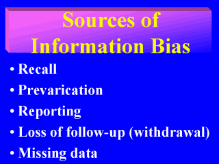 | Recall bias occurs when individuals remember differently previous events. Prevarication bias results from selective revealing or suppression of information. Reporting bias occurs when the data source in one study group differs from the other study group. Loss of follow-up (withdrawal) bias is expected to occur in prospective studies with long follow-up periods. Missing data bias is expected to occur when incomplete records are chosen as source of information. |