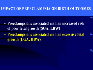 preeclampsia is also associated with an excessive fetal growth such as high birth weight (HBW) and large-for-gestational age (LGA).
