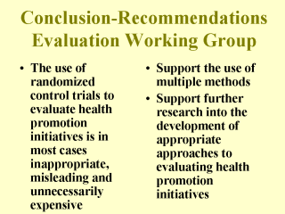 that we started to do that in the WHO Working Group where we concluded that: - "The use of randomized control trials to evaluate health promotion initiatives is, in most cases, inappropriate, misleading and unnecessarily expensive" and recommended that: "Policy-makers should support the use of multiple methods to evaluate health promotion initiatives" and should "support further research into the development of appropriate approaches to evaluating health promotion initiatives" |