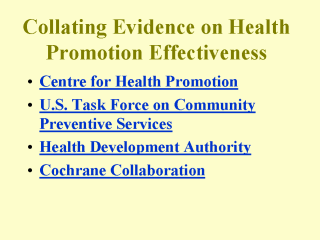 1996 and 2001 - The Symposia asked experts to review evidence on the effectiveness of health promotion in relation to the five action areas of the Ottawa Charter (1996) and on six operational strategies (2001) - This resulted in publication of individual papers,a synthesis paper and proceedings which are available though our Web Site - The second is the US Task Force on Community Preventive Services which I have just mentioned, which will summarize what is known about the effectiveness and cost-effectiveness of population-based interventions for prevention, provide recommendations on these interventions and methods for their delivery based on the evidence, and identify a prevention research agenda. - The third is the Health Development Agency in the United Kingdom which has carried out reviews of effectiveness in relation to particular issues related to the implementation of a national health promotion plan - The fourth is the Cochrane Collaboration which has established health promotion as a field of study |