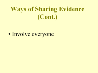 do our best to tailor the communication media to the particular audience. - I'm sure I'm not telling you anything you don't already know, but sometimes it is helpful to remind ourselves that not everyone is as "information rich" as we are - Finally, we need to remind ourselves once again that health promotion is, or should be "participatory" and that the more people are involved in our activities at all stages, the more they will know about them and will be willing and keen to use what comes out of them. - Thus, my final suggestion for sharing evidence on the effectiveness of health promotion is to "involve everyone". |