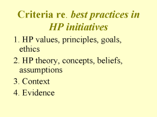 Values,principles, goals and ethics - Theory, concepts, beliefs and assumptions and - the context in which we work - But evidence on the effectiveness of health promotion is critical