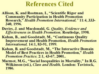 Tones, K., “Beyond the RCT,” Health Education Research,12:1-4, 1997.