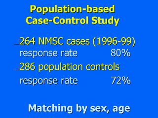 eligible, if 1) they currently resided in this district 2) they were not older than age 80 years 3) the diagnosis of NMSC as a primary, first tumor was confirmed histologically during 1996-1999 Population controls were ascertained from a random address sample of the mandatory registry of the district and frequency-matched to cases on gender and age (5-year classes). bmj.com/epidem/epid.html Coggon D, Rose G, Barker DJP Epidemiology of the Unitiated. BMJ Publishing Group 1997 Contents 5. Planning and conducting a survey 8. Case-control and cross-sectional studies |