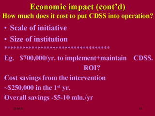 chemotherapy. Another Eg. @ Brigham and Women’s Hospital, Boston, Mass. – prevention of ADE by 17% Costs for developing+implementing $1.9 mln. With maintenance $500,000/yr. Net savings - $5-10 mln./yr. |
