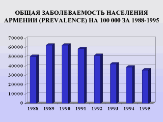 | Из Таблицы следует, что из года в год идёт снижение уровня заболеваемости. Однако в 90-ые годы ухудшение в состоянии общественного здоровья населения в республике было самоочевидным, о чём свидетельствует возрастание уровня как общей смертности, так и по ряду патологий за тот же временной интервал. (Л.Х.Гарибян 1997.) |
