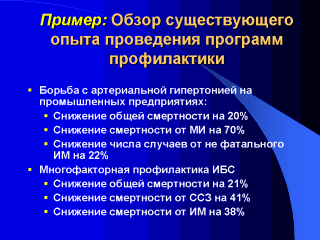 | Известны успехи в области профилактики НИЗ и снижения смерти от них в западных странах. Важно, что в России также существует опыт проведения профилактических программ. Ряд из них показывает эффективность борьбы с факторами риска НИЗ. |