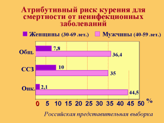 Низкий атрибутивный риск у женщин объясняется малой распространенность среди них курения.