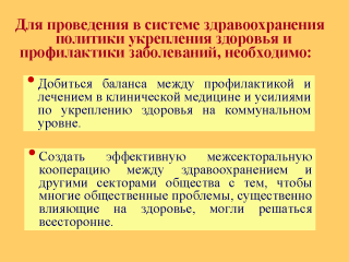 службы здравоохранения: - участие в разработке политики и стратегии профилактики; - создание у населения мотивации по укреплению здоровья и профилактике заболеваний; - пропаганда здорового поведения в отношении курения, питания, употребления алкоголя, физической активности; - использование оптимальных тестов для выявления среди населения факторов риска и оценки индивидуального риска, регистрация этих показателей в медицинской документации; - консультирование и обучение населения навыкам снижения уровней факторов риска в соответствии с социально-экономическими и другими условиями жизни; - мониторирование показателей здоровья населения и факторов их определяющих; - информирование властных структур о состоянии здоровья населения. |