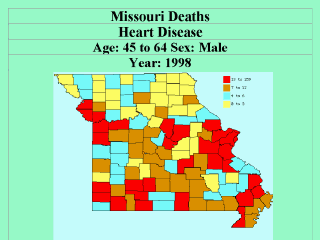 to 259 Brown 7 to 12 Blue 4 to 6 Yellow 0 to 3 Пример ответа по запросу карты штата Миссури с показателями смертности. Примечание: При работе с базой данных в режиме on-line под картой штата будет размещена таблица с показателями смертности по округам штата. |