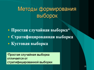 возрастно-половой состав всего населения. Стратифицированная выборка – это выборка, сформированная с учетом каких-либо показателей, чаще всего пола и/или возраста. Обычно стратификация проводится для достижения определенных задач исследования (например, сформировать одинаковые по размеру возрастно-половые группы населения или набрать достаточное число наблюдений по какому-либо нечасто встречаемому признаку. При оценке результатов, полученных на стратифицированных выборках требуется их «взвешивание» для экстраполяции на все население. Кустовая выборка чаще всего применяется при проведении на больших территориях и является многоуровневой. |