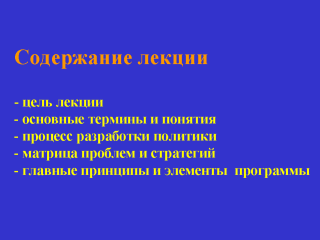 Структура лекции построена по системному принципу и включает два основных блока вопросов относящихся к разработке политики и программы.