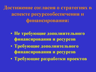| Под ресурсами понимаются материальные, людские, технические, финансовые возможности выполнения мероприятий в рамках выбранных приоритетных стратегий. В большинстве случаев речь идет об изыскании средств для необходимых для разработки и выполнения конкретных проектов или программ. |