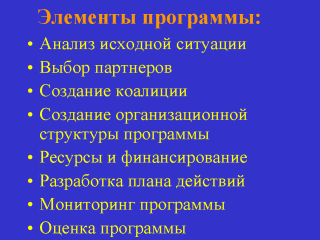 | Дизайн программы, включающий ее элементы, разрабатывается координационным комитетом или рабочей группой. Программа может носить стратегический характер или характер плана действий с более детальной разработкой активности. |