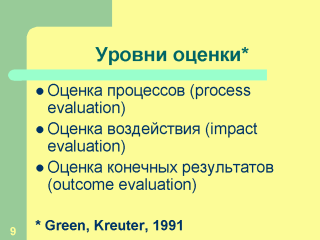 отвечает каждый уровень оценки различны. Оценка процессов (process evaluation) отвечает на вопрос «Что делается? Для кого? И Как?» Оценка воздействия (impact evaluation) отвечает на вопросы «Какие результаты получены при внедрении программы? Какие наиболее быстрые результаты получены и как их можно распространить?» Оценка конечных результатов (outcome evaluation) достигнуты ли запланированные цели и произошли ли изменения в смертности, заболеваемости, качестве жизни. |