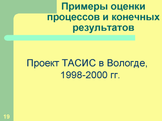 оценка процессов. Начало проекта – выяснялась ситуация в отношении НИЗ, ФР, профилактики, структур, кадров, их отношение, мнение и т.д. Оценка процессов показала, что развивается образование населения, профессионалов, происходят организационные изменения, законодательный процесс. Эти процессы оказали влияние на уровень знаний медиков, в отношении к профилактике. Конечные результаты проекта ТАСИС – какие и когда? |