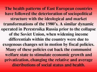 | This paper defines the macro level determinant of health as social inequality, the variation in the distribution of social characteristics across groups living in small urban areas comprising the 33 administrative districts of the city of Moscow. |