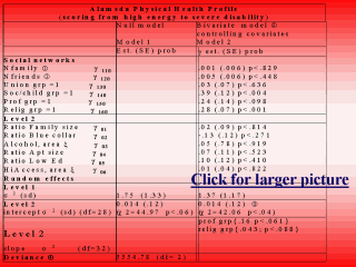 on personal habits, social connections, and relative inequality, Moscow, 1991 Appendix II: The multilevel equation for the Alameda Physical Health Profile is similar to an ordinary least squares regression, except for including both individual level variables and urban area level variables in the same equation, and a complex error term: Yij =[ g 00 + g p0Xpij + g 0qZqj + g pqZqjXpij ]+[ u1jXpij + u0j + eij ], where Yij is the level of physical health for individual i in urban area j; p is the number of explanatory variables X for individual i; q is the number of explanatory variables Z at urban area j; ij=individual observation i in urban area j; Zqj=cross-level or micro-macro interaction, as the value of Y-X slope at the individual level with Z at the urban level. The fixed component of the regression, which is invariate between urban areas, is contained in the first set of parentheses. The complex error term within the second set of parentheses denotes the random component of the regression or the residual variation between urban areas, after the individual level variables are controlled. If there is no contextual effect and the residual variation is explained entirely by the fixed component, the hierarchical linear regression will produce the same results as an ordinary least squares solution. |