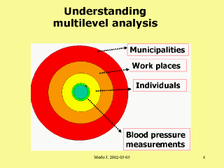 | EXAMPLE:In this MULTILEVEL structure Blood pressure measurements are nested within individuals. Individuals are nested within work places. Work places are nested within municipalities. Blood pressure measurements tend to be similar within an individual ! Individuals tend to be similar within a work place ! Work places tend to be similar within a municipality ! |