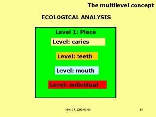 | WE ARE STILL STUDYING ”CARIES” We aggregate CARIES, TOOHT, MOONTH, and INDIVIDUAL level information to the higher PLACE level and create a NEW LEVEL 1 that we call “PLACE” But we “loose” information when we AGREGATE Even when we are interested in places we need to consider all the levelste CARIES, TOOHT, MOONTH, and INDIVIDUAL level information to the higher PLACE level and create a NEW LEVEL 1 that we call \'93PLACE\'94\par }\pard\fs24\ppscheme-1\cf1\lang1033 {\f1\ Differences between areas may depend on the individual composition of the areas (COMPOSITIONAL EFFECTS) rather that on pure area effects (CONTEXTUAL EFFECTS). There is also risk for exaggerating area-effects. |