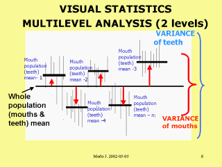 population of teeth, but we consider another level, the mouth level. There is a population of teeth nested in a population of mouths. Each tooth has a tooth health status value that differs from the whole population (mouths & teeth) mean. This is called (tooth) “RESIDUAL” or also “ERROR” in statistics. Each mouth has a mean tooth health status value that differs from the whole population (mouths & teeth) mean. This is also called (mouth) “RESIDUAL” or also “ERROR” in statistics. You can se (the red arrows) that all teeth within a mouth have a common (mouth) difference from the whole population (mouths & teeth) mean. All teeth within a mouth have basal health status that is determined by the mouth they are located. VARIANCE in statistics is a summary measure of the overall differences. There is a variance at the teeth level (LEVEL 1) and a variance at the mouth level (LEVEL 2). |