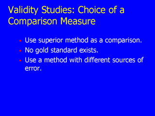 method, ideally a gold standard. - Epidemiologic studies are most interested in assessing typical or long-term physical activity due to its potential association with disease. - However, there are no perfect measures of typical or long-term physical activity. All measures have error, although they differ in magnitude and type. - Given that neither the questionnaire nor the comparison measure will be perfect, the error of both should be as uncorrelated as possible to avoid falsely high estimates of validity. |