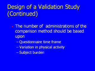 | - In general, the number of administrations of the comparison measure should be based upon the time frame of the questionnaire, variation in physical activity, and consider subject burden.- In the prior example, the comparison measure covered the interval of time corresponding to the questionnaire - 1 year. Each seasonal administration included a sufficient number of days to represent average energy expenditure (i.e. 7 days). |