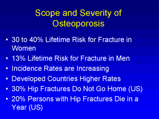 the lifetime risk for an osteoporotic fracture for women is 30 to 40%. For men, this risk