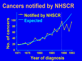 Why do the numbers diagnosed each year increase? Our cohort was a BIRTH cohort, so the number of children in the cohort increased every year. In 1971 there were just over 158,000 children in the cohort, in 1972 there were just over 165,000 children, etc. Also, the mean age increased every year and older people are more likely to get cancer. Why does the number start to fall after 1989? We think it is because NHSCR were several years behind in recording cancers. Getting these details is complex and involves a lot of checking. |