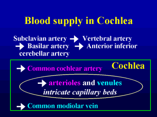 | The arterial supply to the cochlea is provided by the common cochlear artery and venous drainage of the cochlea is provided by the common modiolar vein. The common cochlear artery and common modiolar vein branch to form intricate capillary beds in the cochlea. |