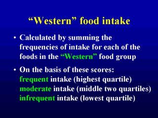 of the foods are; lowest frequency of intake = 1 middle frequency of intake or missing = 2 highest frequency of intake = 3 Participants were divided into three groups on the basis of sum of these scores (frequent, moderate and infrequent intake of "Western" foods). The Cronbach alpha value for Western foods was 0.68. |