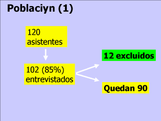 al que acudieron 120 personas. De ellas pudimos contactar con 102, de las que 12 manifestaron algún síntoma sin llegar a cumplir con la definición de caso: vómitos o diarrea (>=2/día) más dolor abdominal, fiebre (>37.5ºC) o dolor de cabeza. Con los 90 restantes se realizó el estudio del brote. |