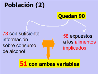 bien respondido. El análisis realizado con esta submuestra mostró los mismos resultados en cuanto a los alimentos implicados. el resto de diferencias fueron pequeñas: edad (34 vs 40 años), sexo (53% vs 58 % mujeres) o porcentaje de casos (54 vs 42). Aunque se puede analizar toda la población, cabe pensar que si el alcohol tiene un efecto protector, éste será entre el grupo expuesto a Salmonella. |