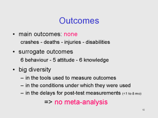 their consequences. Each research group used different tools and different conditions to measure outcomes and the delay for the post-test measurement varied from less than one month to 8 months. Because of the variety of interventions and outcomes we decided it was not appropriate to do a meta-analysis. |