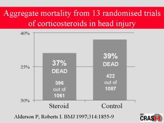 corticosteroids in head injury - This graph shows the combined mortality data from 13 randomised controlled trials of corticosteroids in head injury - Each trial of corticosteroids was small - the largest included only a few hundred patients, and together they have involved only about 2,000 patients - Overall, the risk of death in the corticosteroid treated group appears to be about 2% lower than in the control group - If corticosteroids did reduce the risk of death by 2%, and reduced the risk of disability by a similar amount, then treatment of 500,000 patients would avoid 10,000 deaths and prevent 10,000 permanent disabilities |
