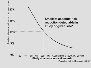 reduction detectable in trials of a given size - On the horizontal axis is the study size (that is, the number of patients randomised in the trial) - And on the vertical axis is the absolute risk reduction that would be detectable - So, for example, suppose after head injury 20% of patients were dead. For a study to detect a 10% absolute risk reduction, that is from 20% dead to 10% dead, we would need a study with about 400 patients |