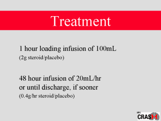 with all treatment packs - The treatment is a loading infusion of 100mL, given over one hour - Followed by an infusion of 20mL per hour for 48 hours, or until discharge, if this is sooner - Each treatment pack contains - 11 x 2gm vials of methylprednisolone (MP) or placebo - an intravenous infusion set - CRASH stickers to be attached to the bags and to the front cover of the patient notes (The steroid dosing regimen is that used in the NASCIS 2 and NASCIS 3 trials of MP in acute spinal cord injury. However, fixed doses will be used in order to simplify the procedure. A 48-hour corticosteroid infusion is being tested because recent trials of MP in acute spinal cord injury have indicated slightly more neurological recovery with 48 than with 24 hours.) |