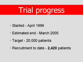 the Pilot Phase in April 1999 - Recruitment is estimated to end in 2005 - Our target is to reach 20,000 patients - Our recruitment to date is 2,420 + patients |