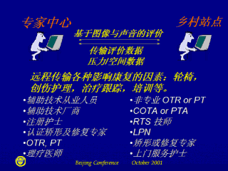 | Teamwork Two groups are loosely defined as the TeleRehab “experts” or specialists and those at TeleRehab personnel “rural” sites. However it is very important to understand that in order for the client to receive the best care the “expert” and the rural individuals are members of a team each of whom has different and equally pertinent information vital to a good outcome. Constituencies It is generally assumed that the two groups would be split as indicated in the slide, but it may well be that there is considerable overlap, depending on local resource issues. That is, in a particular health care system, who are the health care providers visiting clients in their homes or places of work. |