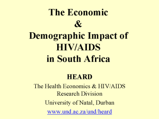 | This lecture provides students with an overview of the current and future trends in HIV/AIDS in South Africa. It focuses particularly on the demographic, economic and social impact of the disease and also provides some suggestions as to the socio-economic determinants of HIV/AIDS for KwaZulu-Natal, the worst affected province in South Africa. |