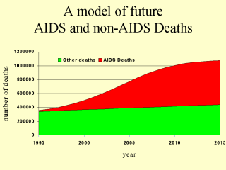 represents the Metropolitan Life projections made about future AIDS and non-AIDS deaths. Deaths due to non-AIDS are predicted to remain relatively constant, however deaths due to AIDS are predicted to rise steadily and rapidly between 2000 and 2015. By 2015 over half of all deaths will be AIDS-related. Models such as this are important as they provide planners and policy makers with some indications of possible future circumstances. These models also provide statistics for phenomenon not usually measured because of a lack of data. For further information on AIDS related adult mortality in South Africa see the Medical Research Council’s “The impact of HIV/AIDS on adult mortality in South Africa”, available at www.mrc.ac.za/bod/ |