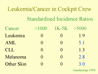 Increased incidence ratios of cancer and leukemia were only observed in cockpit crew members flying more than 5000 hours. Significantly increased ratios were observed for acute myeloid leukemia, melanoma, and other skin cancers. Do you think that the melanoma and skin cancers are related to cosmic radiation or some other factor? Many postulate that these cancers may be related to higher sun exposures among the crew compared to the general population.