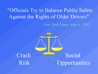 | The debate is over finding the proper balance between the crash risks identified in the older driver and the diminished social opportunities that may arise if driving privileges are removed. We are having a difficult time in finding this balance at the present time. |