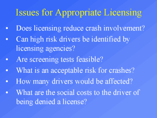 | NHTSA has identified the following research questions that require further information before licensing-based interventions can be effective. There are several fundamental questions that remain without answers. These include identifying high risk drivers, the effectiveness of licensing in reducing crashes, and the costs involved. |