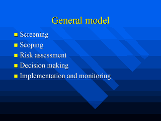 | The general model used by the National Assembly for Wales (20) combines both previously described models and makes them more ”policy maker friendly”. It describes a five step model including screening, scoping, risk assessment, decision making and implementationa and monitoring. The basic characteristics of each of these steps are described on the following slides. |